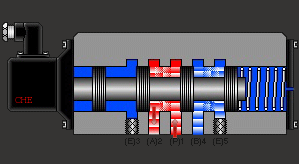 จากภาพ port (P)1 ใช้สำหรับต่อลมเข้า port (B)4 อาจจะต่อเข้ากับปลายด้านหนึ่งของกระบอกลม เพื่อทำให้กระบอกลมยืดออก port (A)2 ต่อเข้ากับปลายอีกด้านหนึ่งของกระบอกลม เพื่อทำให้กระบอกลมหดเข้า จากตำแหน่งปกติก่อนจ่ายกระแสไฟให้กับโซลีนอยด์วาล์ว แรงดันลมจาก port (P)1 ก็จะไหลออกไปยัง  port (A)2 ทำให้กระบอกลมหดเข้า และเมื่อมีการจ่ายกระแสไฟให้กับโซลีนอยด์วาล์ว ขดลวดโซลีนอยด์ก็จะสร้างสนามแม่เหล็กไฟฟ้า ผลักให้แกนวาล์วเอาชนะแรงต้านของสปริง จึงทำให้แรงดันลมที่ port (P)1 ไหลออกไปยัง  port (B)4 จึงทำให้กระบอกลมยืดออก และแรงดันลมที่ค้างอยู่ภายในกระบอกลม ก็จะถูกปล่อยทิ้งออกไปทาง port (E)3 นั่นเอง และเช่นเดียวกัน เมื่อหยุดจ่ายกระแสไฟฟ้า สปริงก็จะดันให้แกนวาล์วเคลื่อนที่กลับไปยังตำแหน่งเดิม กระบอกลมก็จะหดเข้า แล้วดันลมที่ค้างอยู่อีกด้านหนึ่งออกมาทาง port (E)5