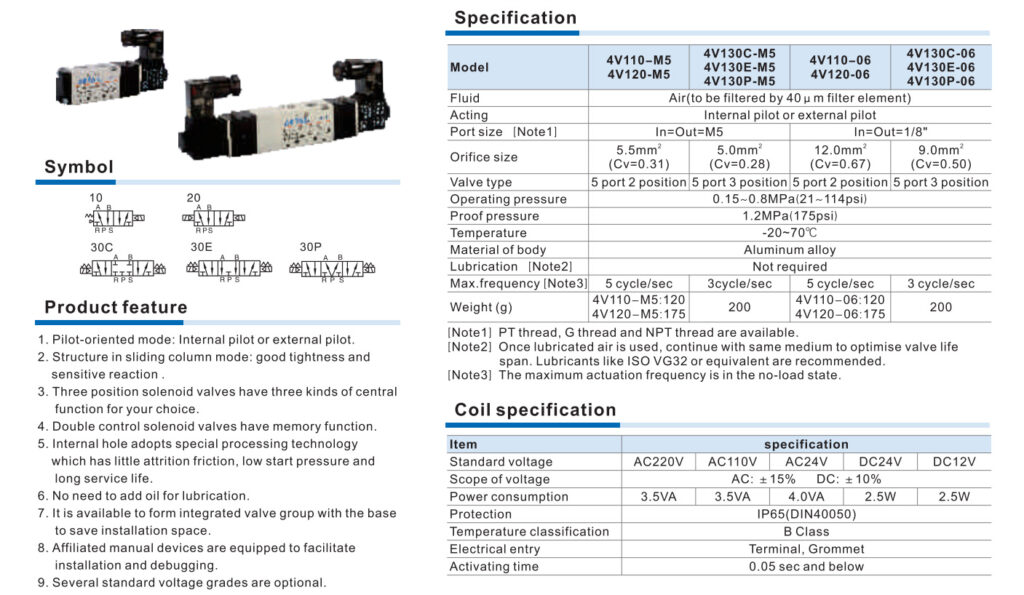 โซลินอยด์วาล์วลม วาล์วควบคุมทิศทางลมด้วยขดลวดแม่เหล็กไฟฟ้า สามารถควบคุมทิศทางลมได้ตามต้องการ มีหลายแบบให้เลือกเช่น 2/2 , 3/2 , 5/2 way และ มีทั้งแบบ N/O ( Normal Open) , N/C (Normal Close) สั่งการร่วมกับสปริงหรือคอยล์ไฟฟ้าอีกตัวเมื่อต้องการให้วาล์วอยู่ อีกตําแหน่ง