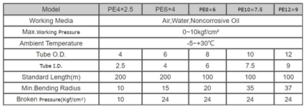 สายลมพีอี (PE TUBE) เหมาะสำหรับใช้นอกอาคาร และนิยมใช้ใกล้กับแหล่งความร้อน เนื่องจากทนต่อรังสี UV และทนความร้อนได้ดี เช่น บริเวณใกล้ฮีตเตอร์ หรือเตาอบ สายลมพีอี PE สำหรับระบบนิวเมติกส์ (OD)Outer Diameter x (ID)Internal Diameter (mm) 4×2.5 6×4 8×5 10×6.5 12×8 16×12