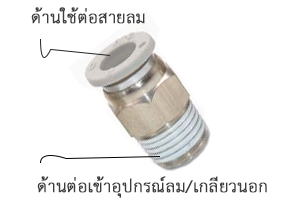 จะมีด้านที่ใช้เสียบสายลมซึ่งจะมีหลายหลายขนาดตามสายลมเรียก od เช่น 4 mm. 6 mm. 8 mm. ส่วนอีกด้านจะเป็นเกลียวที่ใช้ต่อเข้ากับอุปกรณ์นิวเมติกส์ ซึ่งอาจจะเป็นเกลียวตัวผู้หรือเป็นเกลียวตัวเมีย มีหลายหลายขนาดเช่น ¼” ½” 3/8”