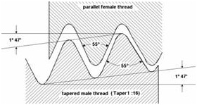 5.เกลียว PT (JIS Standard Pipe) (Taper) เป็นเกลียวสโลพ มาตรฐานญี่ปุ่น ชื่อรุ่นเช่น ¼”PT ลักษณะเป็นเกลียวเอียง ปลายโค้งมน มุมยอดเกลียว 55 องศา