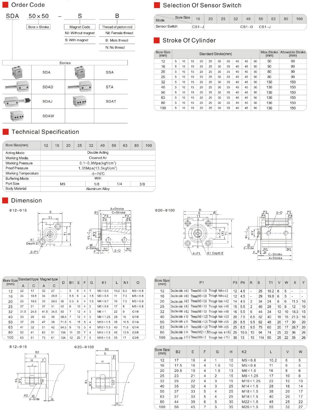 กระบอกลม รุ่น SDA, SDA-S ทำงานแบบ 2 ทิศทาง (DOUBLE ACTING TYPE) มาตรฐาน AIRTAC