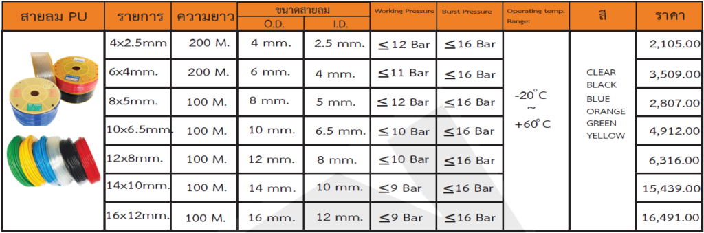 สายลมพียู PU สายลมโพลียูริเทน (Polyurethane) อีกอุปกรณ์ที่ขาดไม่ได้ในงาน Pneumatic ผลิตจากวัสดุโพลียูรีเทนคุณภาพดี มีคุณสมบัติที่ทนต่ออุณหภูมิ ทนต่อแรงดันได้สูง ตัววัสดุมีความยืดหยุ่น มีน้ำหนักเบาสำหรับระบบนิวเมติกส์ -ขนาดมีดังนี้(OD)Outer Diameter x (ID)Internal Diameter (mm) 4×2.5 6×4 8×5 10×6.5 12×8 16×12 และมีหน่วยเป็นนิ้ว(หุน) เช่นสายลมพียู PU ขนาด 2 หุน 3 หุน 4 หุน เป็นต้น สายลมพียูPU จะมีสีต่างกันเช่น สีใส ,สีดำ,สีขาว,ขาวขุ่น,สีฟ้า,สีส้ม สายลมพียูหรือสายลมโพลียูรีเทน มีหลายสีให้เลือกใช้งานจึงเหมาะสมกับการติดตั้งที่ต้องจำแนกชนิดของวงจรการทำงาน และทนต่อแรงจากการสั่นสะเทือนได้ดี ทนต่อการกัดกร่อนของสารเคมีได้ดี (High resistant to Chemical)สายลมPU หรือ สายลมโพลียูรีเทน(Polyurethane) หรือที่นิยมใช้ในตัวย่อว่า PU ทนการกระแทกทนทานต่อการเสียดสีสายลมพียูสามารถบิดงอได้โดยที่ไม่เกิดความเสียหายและง่ายต่อการติดตั้งทำงานได้ ตลอดอายุภายใต้ความดันคงที่ทนความร้อน -25 +75 องศาC แรงดัน0-10 bar Or150Psi burst pressure 20Bar Or 450Psi แรงดันสูงสุด สายลมที่นิยมใช้จะมีขนาดเป็นมิลลิเมตร เช่น Outer x Internal Diameter (mm) 4×2.5 6×4 8×5 10×6.5 12×8 16×12 และมีหน่วยเป็นนิ้ว(หุน) เช่นสายขนาด 1หุน 2หุน 3หุน 4หุน เป็นต้น ท่ออ่อนจะมีสีต่างกันเช่น สีใส สีดำ สีขาว สีฟ้า สีเหลือง สีส้ม และสีแดง จำหน่ายสายลมนิวเมติก สายลมราคาถูก สายลมขดสปริง สายลมพียู PU,PE สายลม Nylon สายลมเทฟล่อน และสายลมสำหรับงานอุตสาหกรรม เช่น PU Tube, Nylon Tube .Nylon เทฟล่อนPtfe ภายใต้ยี้ห้อ CXF TKC SFC SMC AIRTAC CONEX Semax Festo ท่อสายลมอ่อนสำหรับระบบลมหรือระบบนิวแมติกทำมาจากไนล่อนหรือโพลียูรีเทน(PU) ใช้เชื่อมต่อกับฟิตติ้งหรือวาล์วต่างๆเพื่อไปต่อกับกระบอกลม สายลมประเภทนี้จะสะดวกกับการใช้งานที่มีการเคลื่อนไหวไปมา และสามารถถอดใส่ได้ง่ายโดยจะใช้ร่วมกันข้อต่อลมหลายประเภท ฟิตติ้งต่างๆ หรือข้อต่อแบบสวมเร็ว